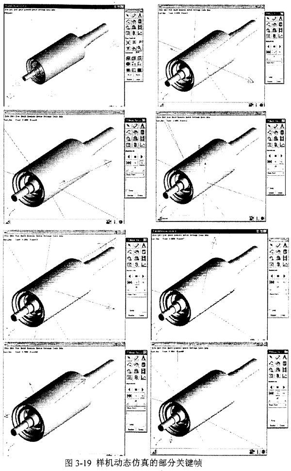 仿真開(kāi)始后,ADAMS-View自動(dòng)調(diào)用ADAMS-Solver進(jìn)行求解,并實(shí)時(shí)地將每一幀顯示在屏幕上,形成動(dòng)畫(huà)。仿真過(guò)程的部分關(guān)鍵幀見(jiàn)圖3-19。