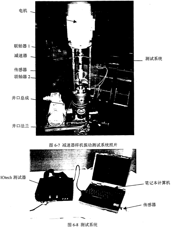 由于電動(dòng)潛油螺桿泵采油系統(tǒng)的效率從本質(zhì)上要遠(yuǎn)高于傳統(tǒng)的游梁式抽油機(jī)系統(tǒng)和地面驅(qū)動(dòng)螺桿泵采油系統(tǒng),而減速器作為電動(dòng)潛油螺桿泵采油系統(tǒng)的一個(gè)組成部分,其效率提升對(duì)整個(gè)系統(tǒng)的效率提升作用不十分明顯,另一方面,立式的試驗(yàn)系統(tǒng)結(jié)構(gòu)僅螺桿泵、減速器和電機(jī)三項(xiàng)的地面總高度就達(dá)到3.128m,如果測(cè)試樣機(jī)的效率,還要在樣機(jī)的輸入和輸出端上各安裝一個(gè)轉(zhuǎn)矩轉(zhuǎn)速儀,從而使得整個(gè)系統(tǒng)的地面高度達(dá)到4m多,己超出了實(shí)驗(yàn)室吊車的吊裝高度。所以,本章不進(jìn)行效率測(cè)試,只進(jìn)行振動(dòng)試驗(yàn)研究。