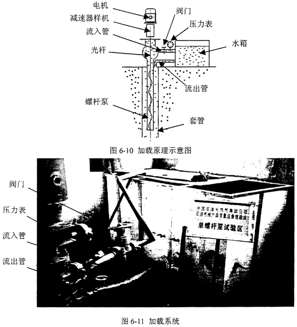 本試驗(yàn)井的加載是通過(guò)將并下的水舉升到地面時(shí),人為設(shè)置流水的阻力實(shí)現(xiàn)的。其加載原理見(jiàn)圖6-10所示。其中水箱的水由于重力的作用通過(guò)流出管流到地下。螺桿泵工作時(shí),將井下的水舉升到地面并通過(guò)流入管送回水箱中,在流入管的管道上設(shè)有閥門和壓力表,通過(guò)它們來(lái)調(diào)整流入管內(nèi)水的壓力來(lái)實(shí)現(xiàn)加載。具體結(jié)構(gòu)照片見(jiàn)圖6-11。