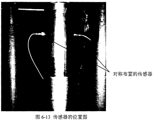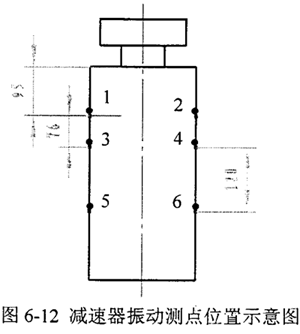 測(cè)點(diǎn)布置方案是關(guān)系到測(cè)量結(jié)果的一件重要工作,應(yīng)選擇信號(hào)傳遞路線最短、最能反應(yīng)減速器振動(dòng)的部位作為測(cè)點(diǎn)。本實(shí)驗(yàn)中測(cè)點(diǎn)對(duì)稱布置在減速器外殼與活齒中點(diǎn)在同一水平線的兩個(gè)點(diǎn)1 、2 上,用以采集第一排活齒引起殼體振動(dòng)的信號(hào)。同樣,測(cè)點(diǎn)3 、4 采集第二排活齒引起殼體振動(dòng)的信號(hào)。測(cè)點(diǎn)5 、6 布置在輸出軸的支承軸承所對(duì)應(yīng)的殼體位置上,用以測(cè)量輸出軸軸承座的徑向振動(dòng)。各測(cè)點(diǎn)的位置示意圖見(jiàn)圖6-12,實(shí)際測(cè)試時(shí)傳感器的位置見(jiàn)圖6-13。