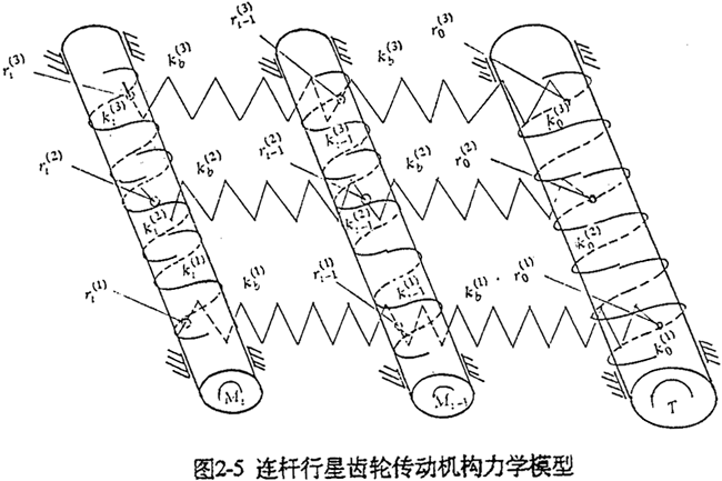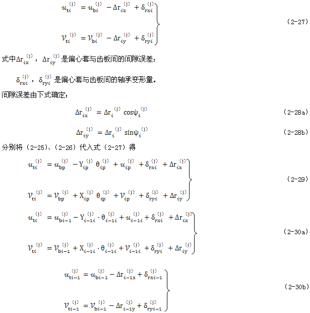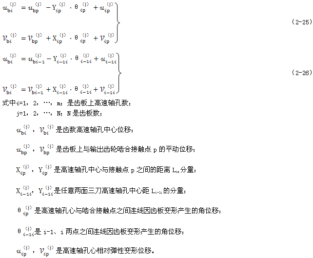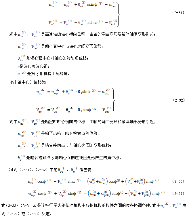 式(2-40)就是少齒差連桿行星齒輪傳動初喲多齒接觸承載的位移協(xié)調條件。用于多相并列少齒差連桿行星齒輪傳動機構時,由此消去C(j)后可列出Σni=1(Z(j)-1)個補充方程。
