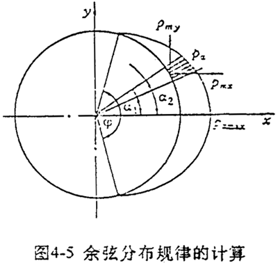 確定作用于結(jié)構(gòu)邊界上的非均布載荷是一件復雜工作,往往需要進行一些較復雜的計算,譬如采用接觸問題有限元法進行計算。在實際應(yīng)用中常采用一些近似的假設(shè)規(guī)律來代替這些復雜的未知分布規(guī)律。對于軸承載荷,一般假設(shè)沿周邊按余弦規(guī)律分布如圖4-5所示,即