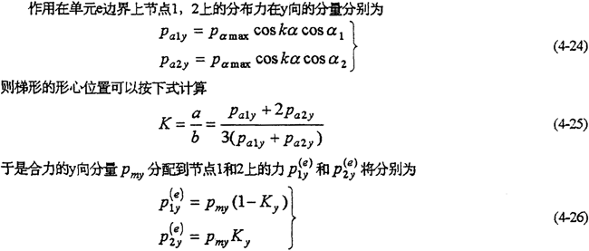 然后,按靜力學等效原理,將微段上的合力或其分量分別移置到對應(yīng)的邊界各節(jié)點上。因邊界上各節(jié)點之間的微段一般較短,可認為各微段上的作用力近似梯形分布,而Pmx,Pmy就可以認為是作用在梯形的形心上(圖4-6(a))。