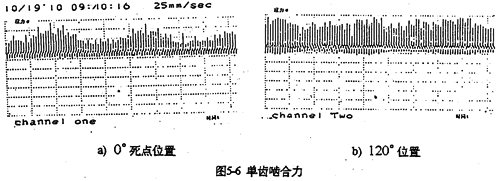 理想情況下,嚙合力的極小值在φ=0°、180°產(chǎn)生,極大值在φ=90°、270°產(chǎn)生,造成位置偏離的影響因素主要有軸承剛度,齒板剛度,嚙合角以及輸入轉(zhuǎn)速、傳動比等等。其中軸承剛度的影響極大。在死點的嚙合力也產(chǎn)不并一定為零。哈合力可能為負值。為負值時,將阻礙傳動的正常轉(zhuǎn)動,產(chǎn)生內(nèi)齒輪副的干涉現(xiàn)象。并引起減速器沖擊振動。因此,按照嚙合力過死點時為零的假設分布規(guī)律以及嚙合力為常數(shù)分布規(guī)律的模型分析,所得結果都是不可靠的。圖5-6是齒板死點位置180°及另一齒板位于超前120°嚙合點的單齒嚙合圖的測試結果。圖中每一棒線代表被測齒受嚙合力作用一次。比較兩圖可知,死點位置嚙合力總體水平低于120°位置時的嚙合力總體水平,與理論分析計算的結果完全吻合。