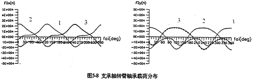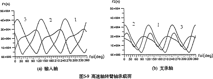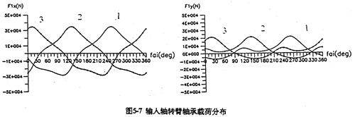 4.輸出軸的行星軸承總體載荷比支承軸行星軸承總體載荷大(圖5-9),特別是輸入軸X方向受力最大。輸入軸行星軸承載荷在死點附近取得最小值,在φ=105°、255°取得極大值。極大值產(chǎn)生的位置正好是機構傳動角最佳位置附近。在同一時刻,齒板上各輸入軸行星軸承的受力狀況是不是一樣的。當某一齒板接近其死點位置時,軸承載荷較小,而同時另外兩片遠離死點位置的齒板上輸入軸行星軸承載荷要大得多。支承軸的軸承載荷在一個周期內(nèi)分別出現(xiàn)三次極大值和三次極小的值。由于這個原因使支承軸偏心套的微動磨損比輸入軸偏心套的微動磨損更為嚴重。行星軸承載荷的最大值為