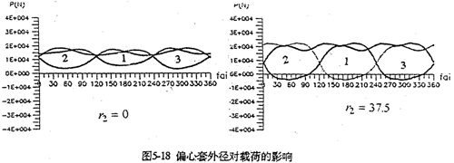 圖5-18是偏心套外徑對嚙合圖的影響。當(dāng)不考慮偏心套外徑(r2=0)時(shí),嚙合力分布為正值?紤]偏心套外徑(r2=37.5mm)計(jì)算結(jié)果,出現(xiàn)負(fù)向嚙合力。而且其幅值明顯增大。輸入扭矩也不再是固定值。因此,對三環(huán)減速器進(jìn)行動力計(jì)算,必須考慮r2的影響。此外,行星軸承內(nèi)外圈接觸承載位置,也影響三環(huán)減速器的動力性能。