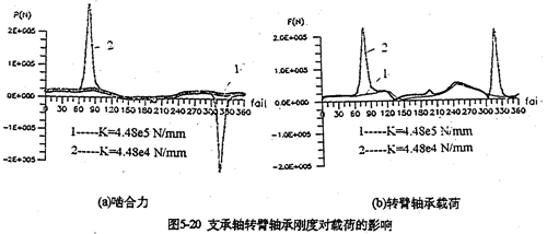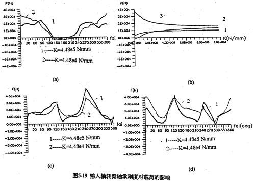 只考慮行星軸承變形及齒板變形時(shí),影響三環(huán)減速器載荷特性的剛度,主要是行星軸承剛度、和內(nèi)齒圈的變形剛度。軸承剛度與軸承材料、間隙、油膜等很多因素有關(guān)。圖5-19是輸入軸行星軸承剛度對嚙合力及行星軸承載荷的影響。當(dāng)輸入行星軸承剛度小一個(gè)數(shù)量級時(shí),負(fù)向嚙合力區(qū)域增大(見圖5-19a);隨剛度減小、各相嚙合力越不均恒(圖5-19b),輸入軸行星軸承剛度的影響比輸入軸行星軸承剛度更大,見圖5-20所示。嚙合力及各行星軸承載荷在軸承剛度較小的情況時(shí),都出現(xiàn)正常載荷的10倍以上的沖擊現(xiàn)象,沖擊產(chǎn)生的位置隨剛度變化不同。內(nèi)齒圈剛度對載荷的影響與行星軸承剛度相反(見圖5-21所錄)。當(dāng)剛度越小時(shí),三相齒板的嚙合力越均恒(見圖5-21a),而且行星軸承載荷幅值基本上不變(見圖5-21b)。同此可推知,減小三環(huán)減速器振動的途徑之一就是提高行星軸承剛度,減小內(nèi)齒圈剛度。這可以通過對行星軸承進(jìn)行預(yù)緊,和采用軟齒面或大柔度齒圈的辦法,以使嚙合力和行星軸承載荷均衡化,以達(dá)到減振降噪的目的。