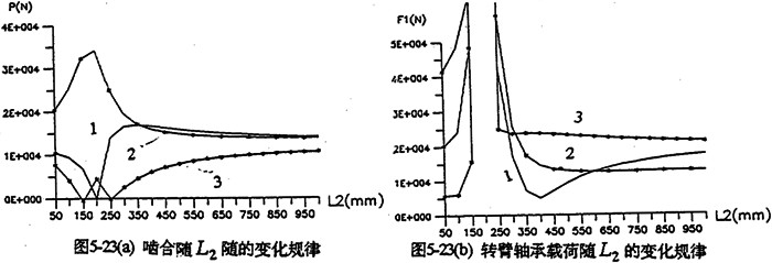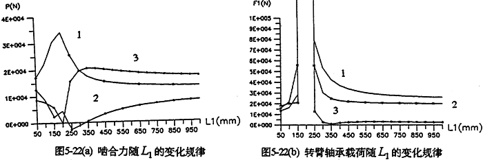 各軸水平布置時(shí),軸間的中心距變化,將引起各載荷大小幅值、規(guī)律均發(fā)生變化。圖5-22是輸入軸相對輸出軸位置變化時(shí),減速器的嚙合力及軸承載荷變化情況。由圖可知,當(dāng)輸入軸與支承軸中心距(L2=200mm)很小時(shí),三齒板的嚙合力分配很不均衡,隨著L1的增加嚙合力趨于均衡(見圖5-22a)。行星軸承載荷變化情況見圖5-22b所示。