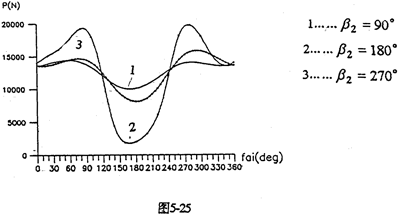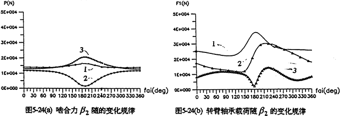 當(dāng)輸入軸與軸出軸的中心距確定后,可通過調(diào)整支承軸的位置,滿足特殊的空間位置要求,或者設(shè)計(jì)成載荷分布特性最優(yōu)、幅值最小的減速器。圖5-24是中心距L1=400mm、L2=200mm時(shí),支承軸相對于輸出軸轉(zhuǎn)動的角位移β2變化時(shí)嚙合力及行星軸承載荷的分布情況。由圖看出,各種載荷均在180°附近(SHQ偏置式減速器)取得極大值。在0°~90°和270°~360°范圍(Ⅰ、Ⅳ限內(nèi)),三相齒板嚙合力分配很均衡,嚙合沖擊很小。因此。設(shè)計(jì)三環(huán)減速器時(shí),為減小載荷的幅值和各相之間載荷的差值、支承軸應(yīng)盡可能遠(yuǎn)離180°,即不采用三軸心共線的水平位置的結(jié)構(gòu)。圖5-25為幾個(gè)特殊位置的嚙合力隨轉(zhuǎn)角變化的分布規(guī)律。