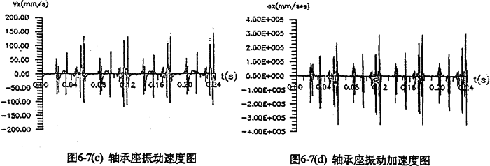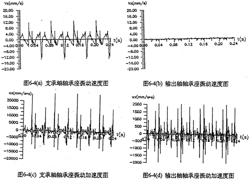 圖6-4是支承軸軸承座及輸出軸軸承座的振動速度及振動加速度時域圖。圖(c)中,一個周期內(nèi)的三根較長的沖擊棒線分別是三相機構(gòu)因死點引起的嚙合沖擊。軸承座的振動速度比齒板的振動速度小,但振動加速度比齒板振動加速芳略大,最大值為