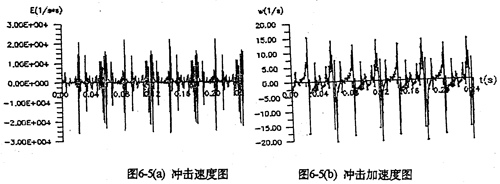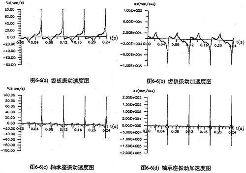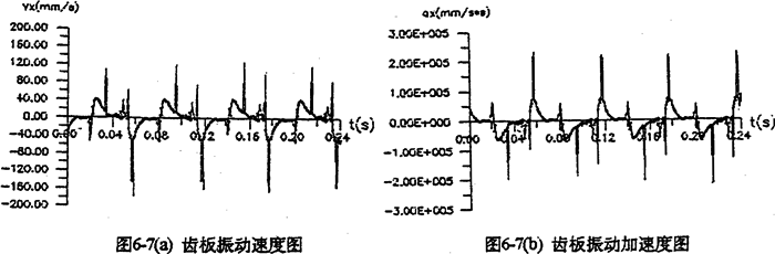 圖6-7是某相雙曲柄機構(gòu)在輸入端具有0.03mm間隙時,齒板及軸承座的振動速度、振動加速度。圖中表明,速度、加速度都在兩個死點位置出現(xiàn)較大的沖擊值。