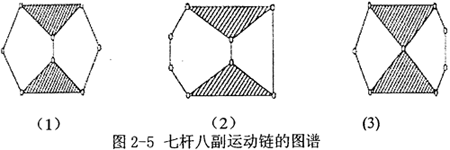 對于(5,5)來說,只有一種連接方式,作為一種混合動力驅(qū)動系統(tǒng)已有人做過研究,在本論文中,不能滿足設(shè)計要求,因此不可取;而(9,11)及以上又有40個(或更多)運動鏈之多,且構(gòu)件多結(jié)構(gòu)復(fù)雜,研究起來非常困難,暫不考慮;先考慮(7,8)七桿八副機構(gòu),其構(gòu)建數(shù)量不是太多,結(jié)構(gòu)不是太復(fù)雜,共有3個運動鏈(如圖2-5),特定化后又有11種(排除同構(gòu)的機構(gòu))特定化導(dǎo)出機構(gòu),可以從中選擇可能適合的方案,因此以下將對(7,8)來詳細(xì)分析研究。
