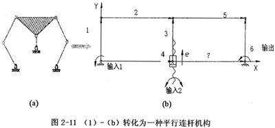 受此啟發(fā),并基于可調(diào)整機構(gòu)的原理,經(jīng)過適當(dāng)?shù)恼{(diào)整,如圖2-17所示,認(rèn)為圖2-18所示的連桿機構(gòu)可以滿足設(shè)計需求。