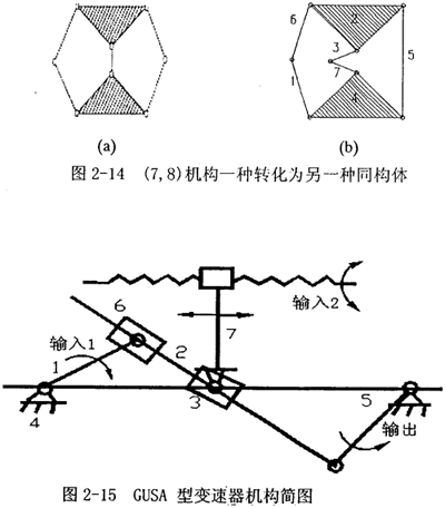 方案三:在眾多已有機構(gòu)類型篩選當(dāng)中,發(fā)現(xiàn)機構(gòu)式脈動無級變速器中的一種:三相并列連桿式(GUSA)脈動無級變速器采用的機構(gòu)可以供鑒。這咱變速器設(shè)計原理為:采用三相并列結(jié)構(gòu),作為輸入機構(gòu)的是相位差為120度的三曲拐曲軸,每個曲拐帶動一套Ⅲ級七桿機構(gòu),如圖所示是(7,8)圖譜中(1)的一種同構(gòu)機構(gòu),圖2-14顯示了它的轉(zhuǎn)化和各桿件的標(biāo)號,可以與圖2-15結(jié)構(gòu)簡圖——對應(yīng)。