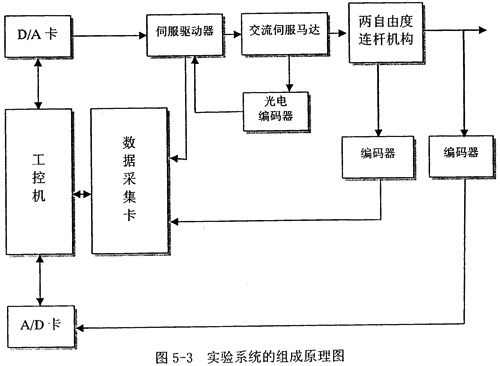 4.數(shù)據(jù)處理:(l)微機(jī)將電機(jī)位置信號作數(shù)值微分求得電機(jī)轉(zhuǎn)速。(2)微機(jī)用數(shù)字濾波程序?qū)⒓铀俣刃盘栕鳛V波、數(shù)值積分等處理。如圖5-3所示為實(shí)驗(yàn)系統(tǒng)的組成原理圖: