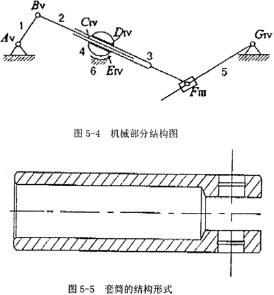 首先將原來的原理圖轉(zhuǎn)換成以下的機(jī)構(gòu)結(jié)構(gòu)圖(僅部分轉(zhuǎn)換),如圖5-4,即原來2、3構(gòu)件之間是滑塊和連桿連接,現(xiàn)改為連桿、套筒改為加一個(gè)擺動軸結(jié)構(gòu),原來滑塊3和地面連接,容易形成過約束,改為加一個(gè)擺動軸承4來和地面、套筒來連接。擺動軸承內(nèi)芯相當(dāng)于一個(gè)球副,其轉(zhuǎn)動中心必為內(nèi)芯的球心,當(dāng)然也是整個(gè)擺動軸承的中心。這樣便于加工查和實(shí)驗(yàn)實(shí)施,而且更重要的是可防止原來原理圖中桿件連接出形成過約束。