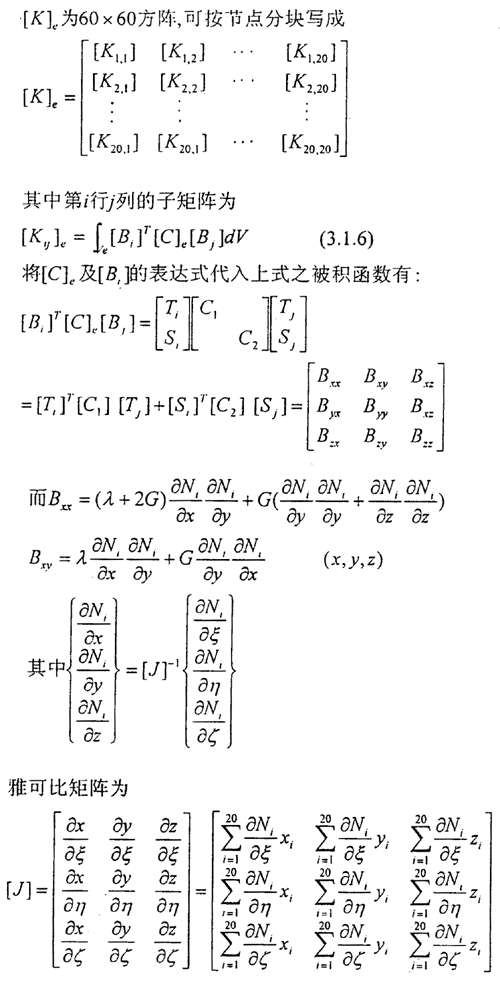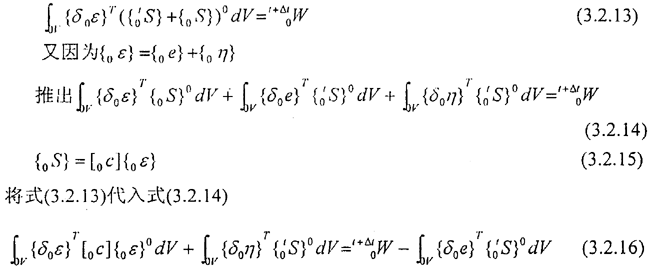 上式是將t+△t時刻的應(yīng)力、應(yīng)變、位移看成t時刻已知的應(yīng)力、應(yīng)變、位移和未知增量應(yīng)力{0S},應(yīng)變{0ε},位移{0u}之和,進一步,增量應(yīng)變{0ε}可用線性部分即{oε}={oe}+{oη}