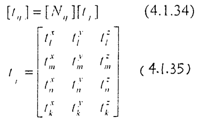 矩陣內(nèi)項表示分布力在單元角點l,m,n,k上沿x,y ,z的分量。對于一個單元有
