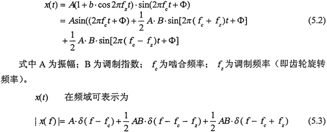 若xc(t)=A·sin(2πfet+φ)為嚙合振動(dòng)載波信號(hào),a(x)=1+b·cosπfzt為齒輪軸的旋轉(zhuǎn)調(diào)制信號(hào),則調(diào)幅后的振動(dòng)信號(hào)