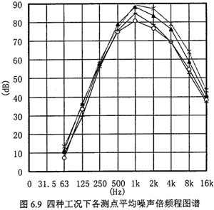 圖6.9為四種工況平均空氣噪聲倍頻程圖譜。由于減速齒輪裝置只是整個(gè)試驗(yàn)系統(tǒng)的一部分,在測(cè)試時(shí),發(fā)聲系統(tǒng)除齒輪箱外,還包括電動(dòng)機(jī)、風(fēng)機(jī)及車間內(nèi)其它相鄰設(shè)備等背景噪聲源,它們將影響減速齒輪裝置的噪聲測(cè)量結(jié)果。考慮這些影響,根據(jù)國家標(biāo)準(zhǔn)《齒輪裝置噪聲聲功率級(jí)測(cè)定方法》(GB6404-1986)的規(guī)定,按各測(cè)點(diǎn)上測(cè)得的1/1倍頻程聲壓級(jí)做對(duì)數(shù)平均,然后進(jìn)行修正,以得到實(shí)際的1/1倍頻程聲壓級(jí)空氣噪聲值。圖6.9為修正后的齒輪減速裝置的倍頻程平均空氣噪聲圖譜。表3為各測(cè)點(diǎn)A 聲級(jí)空氣噪聲值