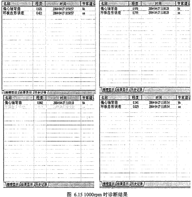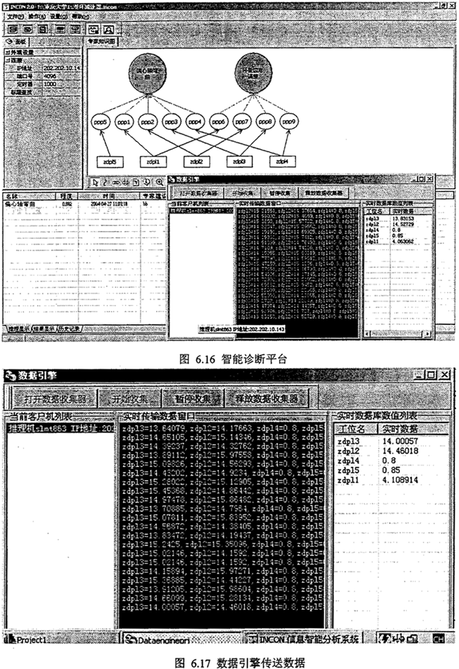 綜上分析,采用人機(jī)交互方式將Zdp14、Zdp15等參數(shù)輸入計(jì)算機(jī),智能診斷系統(tǒng)得到雙環(huán)減速器故障診斷結(jié)果,偏心軸彎曲故障,程度值在0~1范圍變化,齒形誤差較大。智能診斷結(jié)果如圖6.15所示。圖6.16是智能診斷平臺(tái)進(jìn)行現(xiàn)場(chǎng)一線診斷分析,圖6.17是數(shù)據(jù)引擎進(jìn)行實(shí)時(shí)數(shù)據(jù)接收和數(shù)據(jù)發(fā)送。