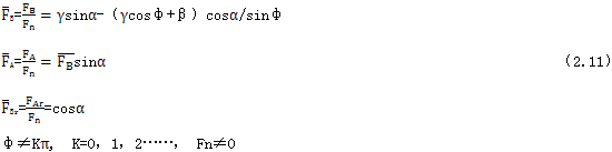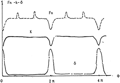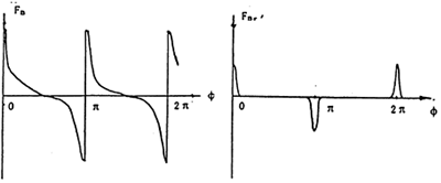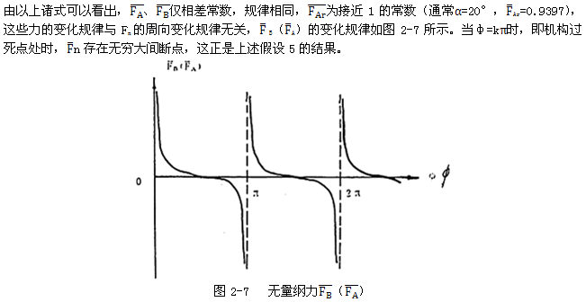 理論上,該力僅在ф=Kπ點(diǎn)產(chǎn)生,而FA、FB將在此點(diǎn)處趨于無(wú)窮大?紤]實(shí)際結(jié)構(gòu)的彈性變形等因素,F(xiàn)Br應(yīng)在ф=Kπ的一轉(zhuǎn)角領(lǐng)域內(nèi)ф=Kπ±△ф產(chǎn)生,而FB、FA在該鄰域內(nèi)由正(或負(fù))向峰值過(guò)零轉(zhuǎn)變?yōu)樨?fù)(正)向峰值,如圖2-10所示。這是因?yàn)镕B、FA在死點(diǎn)位置附近迅速增大產(chǎn)生的彈性變形也會(huì)使環(huán)板產(chǎn)生微小反轉(zhuǎn)角度,而導(dǎo)致FBr的產(chǎn)生,顯然該微小角度領(lǐng)域的大小以及FB、FA所能達(dá)到的峰值決于環(huán)板的剛度。剛度越大,該領(lǐng)域越小,F(xiàn)B、FA峰值越大,F(xiàn)Br的大小與嚙合力及無(wú)量綱參數(shù)(γ+β)成正比。一般情況下,高速重載的三環(huán)減速器、環(huán)板機(jī)構(gòu)的剛度嚙合力等均較大,因此死點(diǎn)處受到的沖擊越大,且沖擊脈沖寬度。ǚ幢扔诮撬俣龋,激振頻率更寬,更易激起廣泛的共振。