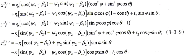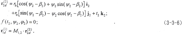 令φ1=φ2=φ,將M1,2、r2d(2)及f(t2,ψ2,φ2)=0解出的φ代入(3-3-6)的第三式,則可得到以t2、ψ2為參變量的外齒輪曲面的表達(dá)式。