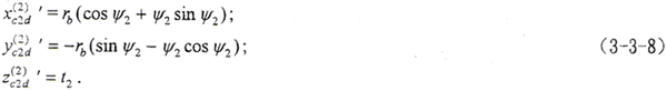 式中 ψ2、t2——曲面參變量;rb——漸開線基圓半徑。設(shè)α2為曲面某一點(diǎn)K處的壓力角,則有ψ2=tgα2。將(3-3-2)式轉(zhuǎn)換到S20坐標(biāo)系,方程為