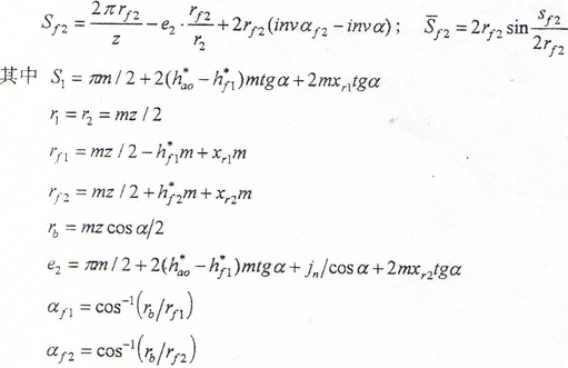 設(shè)齒形角α=20°,頂隙系數(shù)c1*=0.25,模數(shù)齒數(shù)為給定值,根據(jù)這種短厚齒的加工原理是減少滾刀的切入量,使其齒高系數(shù)減小,這也相當(dāng)于使用齒厚減簿的滾刀來(lái)滾切鼓形外齒輪,即相當(dāng)于采用了切向變位加大齒厚。其切向變位系數(shù)xτ1與齒高系數(shù)的關(guān)系為xτ1=2(hao*-hf1*)tgα,式中hao*為滾刀的齒頂高系數(shù),通常hao*=1.25,hf1*為被切外齒輪齒根高系數(shù),hf1*=ha1*+c1*。為了滿足聯(lián)軸器軸間傾角的要求,除外齒輪有一定的鼓度外,內(nèi)外齒之間還應(yīng)有一定的齒間側(cè)隙jn,此側(cè)隙可按一定的原則分配到內(nèi)外齒輪齒厚上,使它們有相應(yīng)的減簿量?紤]加工的因素及總的要求是減簿內(nèi)齒輪齒厚、增大外齒齒厚,因此將jn全部分配在內(nèi)齒輪上,則內(nèi)齒輪切向變位系數(shù)