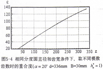 鼓形齒聯(lián)軸器的齒數(shù)模數(shù)決定了其徑向結(jié)構(gòu)尺寸大小。對(duì)于優(yōu)化鼓度曲線的鼓形齒聯(lián)軸器,其嚙合特性與共軛齒面鼓形齒聯(lián)軸器相近,因此我們可以依據(jù)共軛齒面鼓形齒聯(lián)軸器特性來(lái)考慮齒數(shù)模數(shù)的參數(shù)優(yōu)化問(wèn)題。圖5-4給出了相同齒輪分度圓直徑和齒寬條件下取不同模數(shù)齒數(shù)時(shí)的重合度曲線,從曲線可以看出相同齒輪分度圓直徑和齒寬條件下,所取齒數(shù)越多,則重合度越大。重合度越大,平均每對(duì)齒承受的載荷越小,多齒嚙合過(guò)渡狀態(tài)載荷分配的變化量越小,傳動(dòng)越平穩(wěn)。因此總的模數(shù)齒數(shù)的選取原則是盡可能選大的齒數(shù)。但是相同齒輪分度圓直徑條件下,齒數(shù)越大,模數(shù)越小。模數(shù)的減小將降低齒根彎曲強(qiáng)度;另外,由齒面接觸線形態(tài)知,模數(shù)的減小也將降低齒面接觸強(qiáng)度。為保證有足夠的齒根彎曲強(qiáng)度和齒面接觸強(qiáng)度,應(yīng)由所傳遞的轉(zhuǎn)矩和許用應(yīng)力值,先計(jì)算出所允許的最小模數(shù),再根據(jù)這個(gè)模數(shù)值及分度圓直徑來(lái)確定齒數(shù)。由于使用中磨損是不可避免的,因此,選取模數(shù)時(shí)還應(yīng)考慮輪齒齒厚有一定的裕量,保證在一定的磨損程度下仍有足夠的強(qiáng)度。另外,模數(shù)的選取還應(yīng)考慮工藝條件的許可。這些內(nèi)容包含較多的經(jīng)驗(yàn)成份,在此不予詳細(xì)討論。