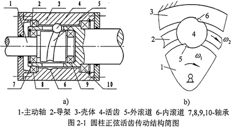 圖2-1所示為圓柱正弦活齒傳動機構的結構簡圖,圓柱正弦活齒傳動由主動軸、殼體、導架及活齒這四個部分組成。殼體的內(nèi)圓柱表面上有周期數(shù)為Z3的內(nèi)正弦滾道,軸承7、8、9、10支撐導架,導架圓周面上均勻分布著軸向活齒槽。軸承7、9支撐主動軸,其外圓柱面上有周期數(shù)為Z1的外正弦滾道,在內(nèi)滾道、外滾道及導架活齒槽的交錯區(qū)域內(nèi)安裝有球形活齒。