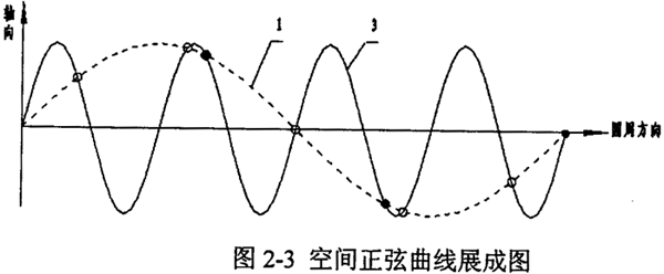 圓柱正弦活齒傳動在工作過程中,幾乎每個活齒都同時參與嚙合,活齒安裝在主動軸與殼體正弦滾道的交叉點處,活齒的安裝位置限制了活齒的數(shù)目n。將空間正弦曲線沿圓柱直母線方向展成平面正弦曲線,如圖2-3所示,其中1線為主動軸正弦滾道曲線,3線為殼體正弦滾道曲線。設正弦曲線切線的斜率有正負之分,則兩條正弦曲線相交,交點可以分為兩類:一類交點指在交點處兩正弦曲線的切線斜率同號(如圖中黑點所示);二類交點指在交點處兩正弦曲線的切線斜率異號(如圖中白圈所示)。若要求圓柱正弦活齒傳動的輸入輸出為同向傳動時,活齒應安放在二類交點處,此時活齒的個數(shù)為n=Z1+Z3;若輸入、輸出為反向傳動時,活齒應安放在一類交點處,此時活齒的個數(shù)為n=|Z1-Z3|。并保證,n≥3。