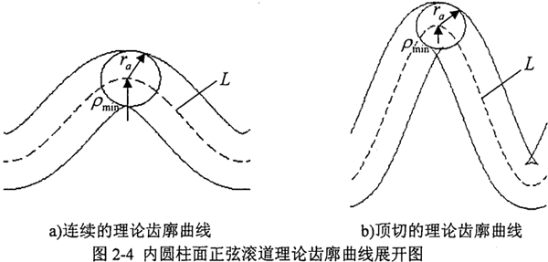 以殼體的正弦滾道為例,將殼體的內(nèi)圓柱面沿圓柱直母線方向展開后如圖2-4所示。當殼體內(nèi)圓柱面上正弦軌跡曲線L的最小曲率半徑ρmin大于活齒嚙合部分小圓半徑ra時,殼體正弦滾道的理論齒廓曲線是連續(xù)的(圖2-4a);當ρmin<ra時,理論齒廓曲線發(fā)生頂切(圖2-4b)。殼體內(nèi)圓柱上正弦軌跡曲線L的方程可表達為: