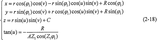 將活齒齒面方程(2-8)的坐標轉(zhuǎn)換到σ1上,并與嚙合方程(2-16)聯(lián)立,即可得到主動軸齒面∑1的方程,即