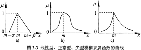 線性型參照函數(shù)在“完全屬于”和“完全不屬于”之間的中介狀態(tài)是線性變化的(圖3-3a),當(dāng)x≤m-α和x≥m+β時,μ=0,說明在(m-α,m+β)區(qū)間之外的數(shù)值完全不屬于該模數(shù)數(shù)。而其他兩種類型的隸屬函數(shù)曲線兩端延伸至無窮遠(yuǎn)(圖3-3b,c)說明整個數(shù)軸上的任何數(shù)總在一定程度上隸屬于該模糊數(shù)。在選擇參照函數(shù)時,除非有絕對的把握認(rèn)為該事件發(fā)生的概率在某個范圍之內(nèi)而選擇線性參照函數(shù),否則,以選取正態(tài)型或尖型為好。