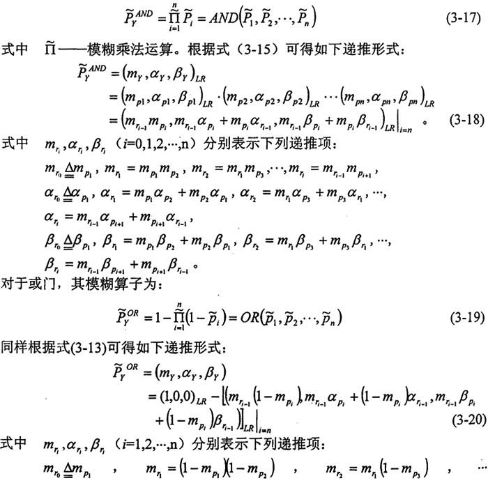 3.3.3.1模糊分析的理論基礎(chǔ) 在故障樹的模糊分析中,采用模糊數(shù)來描述事件發(fā)蘭的概率。模糊數(shù)是由概念上的模糊性或各種模糊因素的影響而造成定量處理時的不確定性。以模糊數(shù)描述概率值,帶有人的主觀性,強(qiáng)調(diào)了人在系統(tǒng)可靠性分析與評價中的重要性。因此,故障樹的模糊分析不僅可減少獲取事件發(fā)生概率精確值的難度,而且能結(jié)合工程中的實(shí)際經(jīng)驗(yàn)和判斷構(gòu)造模糊數(shù)為隸屬函數(shù),較準(zhǔn)確地把它們描述出來,并在一定程度上允許存在描述誤差,具有較大的靈活性和適應(yīng)性。
