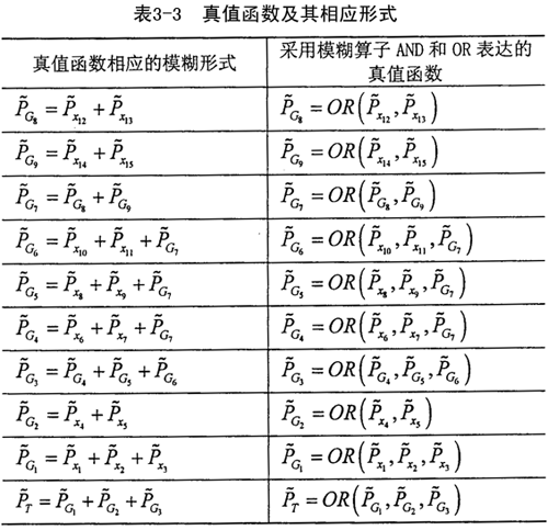 3.3.3.3圓柱正弦活齒減速器故障樹分析 根據(jù)圓柱正弦活齒減速器故障樹,用模糊算子ACD和OR描述基本事件間的邏輯關(guān)系,生成值值函數(shù)的模糊形式及用模糊算子表達(dá)的形式見表3-3。