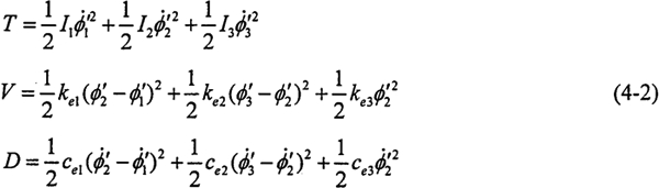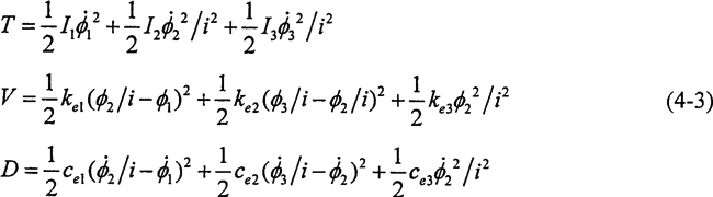 對轉(zhuǎn)換成鏈狀結(jié)構(gòu)的系統(tǒng),應(yīng)用拉格朗日法建立系統(tǒng)的扭振動力學(xué)方程,系統(tǒng)中帶有粘性阻尼,因此列出含有耗散函數(shù)的拉格朗日方程