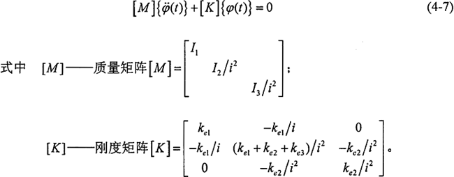 在分析和評價減速器系統(tǒng)扭振特性時,需要計算系統(tǒng)的各階固有頻率以及相應(yīng)的主振型,這就要求解系統(tǒng)的無阻尼自由振動方程。當(dāng)系統(tǒng)自由振動時,激振力矩和阻尼均為零,此時系統(tǒng)的動力學(xué)方程可表示為