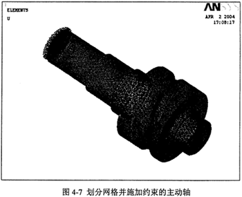 四面體單元每個節(jié)點(diǎn)有三個自由度(Tx,Ty,Tz),通過限制節(jié)點(diǎn)的自由度,對模型施加約束。模擬軸承的作用,在安裝軸承處的零件表面施加約束,首先將表面上所有節(jié)點(diǎn)的坐標(biāo)由笛卡爾坐標(biāo)(x,y,z)轉(zhuǎn)換為柱坐標(biāo)(R,θ,Z),然后限制自由度R。并在主動軸的輸入軸端面和導(dǎo)架的輸出軸端面,限制所有節(jié)點(diǎn)的自由度。劃分網(wǎng)格并施加約束的主動軸見圖4-7。