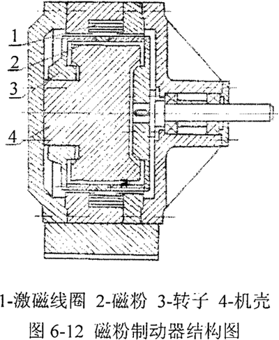 采用磁粉制動(dòng)器作為試驗(yàn)的加載裝置。磁粉制動(dòng)器由轉(zhuǎn)子、機(jī)殼、激磁線圈、磁粉組成,其結(jié)構(gòu)如圖6-12所示。在激磁線圈不通電流時(shí),不產(chǎn)生磁通,磁粉呈自由狀態(tài)。當(dāng)軸轉(zhuǎn)動(dòng)時(shí),由于離心力的作用,使磁粉散布在轉(zhuǎn)動(dòng)件與機(jī)殼之間,若此時(shí)激磁線圈通電流,則在線圈周圍產(chǎn)生磁場(chǎng),轉(zhuǎn)動(dòng)件與機(jī)殼間的磁粉沿磁通方向連接成鏈狀,由于磁粉間的結(jié)合力,使工作面之間產(chǎn)生摩擦力,從而形成制動(dòng)力矩,起到加載的作用。該力矩與激磁電流的大小基本成正比,故通過(guò)調(diào)節(jié)激磁線圈的電流大小可在一定范圍內(nèi)改變制動(dòng)力矩的大小。