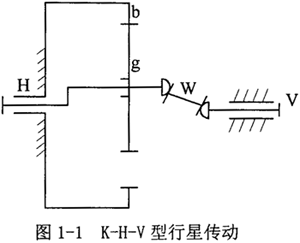 本文所研制的兩級三環(huán)減速器屬漸開線少齒差傳動形式,有必要重點(diǎn)討論一下漸開線少齒差行星齒輪傳動。當(dāng)漸開線內(nèi)嚙合圓柱齒輪副的內(nèi)齒輪和外齒輪齒數(shù)差很少時(shí)(一般為1~4個(gè))所組成的行星齒輪機(jī)構(gòu),稱為少齒差行星齒輪傳動。如圖1-l所示的K-H-V型(也稱N型)是其主要形式,K-H-V型傳動,其內(nèi)齒圈b固定,轉(zhuǎn)臂H是輸入軸。由于它的轉(zhuǎn)動和內(nèi)齒圈的限制,行星輪g作平面運(yùn)動,即行星輪既繞內(nèi)齒圈軸線作圓周平移運(yùn)動,又繞自身軸線作回轉(zhuǎn)運(yùn)動,再用輸出機(jī)構(gòu)W把行星輪的回轉(zhuǎn)運(yùn)動傳遞給輸出軸,從而起到減速作用。