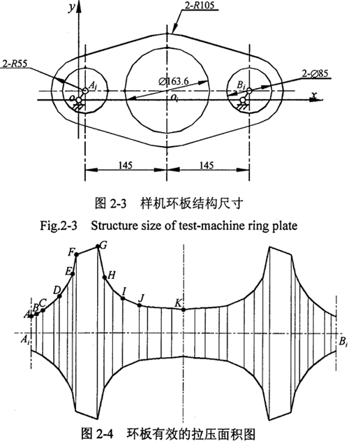 三環(huán)減速機(jī)運(yùn)動(dòng)屬靜不定問(wèn)題,用一般平面剛體力學(xué)方法無(wú)法完全求出機(jī)構(gòu)的作用力,影響到三環(huán)減速器設(shè)計(jì)和傳動(dòng)性能的改進(jìn)。為此需要考慮各構(gòu)件的變形,建立能充分反映三環(huán)減速器實(shí)際受力的變形協(xié)調(diào)條件作為補(bǔ)充方程。三環(huán)減速機(jī)傳動(dòng)機(jī)構(gòu)是雙曲柄連桿機(jī)構(gòu),曲柄的旋轉(zhuǎn)半徑是偏心軸的偏心距,曲柄布置在由支撐軸承支承的偏心軸上,環(huán)板是雙曲柄機(jī)構(gòu)的連桿,傳動(dòng)過(guò)程中的主要變形有各構(gòu)件的接觸變形、軸的扭轉(zhuǎn)彎曲變形、環(huán)板的拉壓變形等等。根據(jù)位移變形分析可知,軸的彎曲變形和環(huán)板的拉壓變形是主要的變形形式。對(duì)于筆者設(shè)計(jì)的如圖2-3所示的環(huán)板,設(shè)A為輸入軸,B為輸出軸。為了計(jì)算上的方便,以前將其簡(jiǎn)化為等截面桿處理。實(shí)際上,由于有效截面的最大面積是最小截面面積的5倍多,這種簡(jiǎn)單地處理和實(shí)際有較大的差別。環(huán)板受拉壓變形時(shí)的有效拉壓面積的形狀如圖2-4所示(單位:mm)。