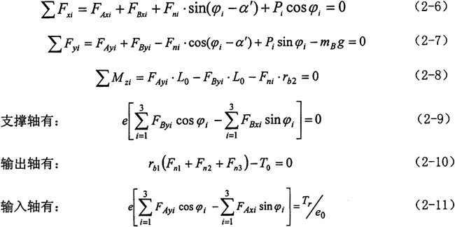 由上式可看出,任意時(shí)刻各環(huán)板上作用的嚙合力是不相等的,且是與轉(zhuǎn)角、環(huán)板和曲柄軸結(jié)構(gòu)尺寸、壓力角以及偏心尺寸有關(guān)的復(fù)雜函數(shù),假設(shè)各嚙合力相等或者是成一簡(jiǎn)單的函數(shù)關(guān)系都是與實(shí)際嚴(yán)格不符的。若需要用簡(jiǎn)潔的函數(shù)關(guān)系加以描述,應(yīng)首先利用上式求出輸出軸旋轉(zhuǎn)一周時(shí)的數(shù)個(gè)嚙合力的表達(dá)式,這里不作詳細(xì)的討論。