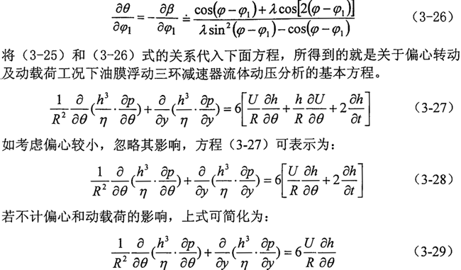 依據(jù)流體動力潤滑理論,首次建立了偏心轉(zhuǎn)動及動載工況下三環(huán)減速器油膜浮動的流體動力潤滑方程,為其動力學研究奠定了基礎(chǔ)。