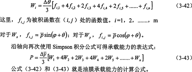 若液體壓力以解析表達式給出,油膜浮動的承載能力可由3-10和3-11式直接積分求得。但由于本節(jié)方法求出的壓力是離散值,其承載能力需用數(shù)值積分求解。本文通過采用Simpson 積分公式的方法,分別沿周向和軸向迭加求值。