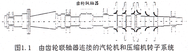以往在對(duì)軸承一轉(zhuǎn)子系統(tǒng)進(jìn)行動(dòng)力學(xué)分析的過程中,對(duì)于構(gòu)成系統(tǒng)的一些典型部件,如轉(zhuǎn)子、支承軸承、密封以及基礎(chǔ)都作過較深入的研究,但對(duì)于聯(lián)軸器耦合效應(yīng)的討論卻不多。直觀地講,多跨轉(zhuǎn)子正是依賴多個(gè)聯(lián)軸器才得以構(gòu)成大型系統(tǒng)的,因此更確切地講對(duì)于大型的多跨(或分跨)轉(zhuǎn)子系統(tǒng)可以稱為軸承—轉(zhuǎn)子—聯(lián)軸器系統(tǒng)。以大型的汽輪發(fā)電機(jī)組和壓縮機(jī)組為例,汽輪發(fā)電機(jī)組在低壓轉(zhuǎn)子、發(fā)電機(jī)轉(zhuǎn)子以及勵(lì)磁機(jī)轉(zhuǎn)子間均采用了剛性或半撓性聯(lián)軸器結(jié)構(gòu);對(duì)于壓縮機(jī)組,在壓縮機(jī)轉(zhuǎn)子和驅(qū)動(dòng)設(shè)備如驅(qū)動(dòng)汽輪機(jī)轉(zhuǎn)子或電機(jī)轉(zhuǎn)子之間也要采用不同形式的聯(lián)軸器。圖1.1所示是一透平壓縮機(jī)組的簡(jiǎn)圖,為一典型的軸承—轉(zhuǎn)子—齒輪聯(lián)軸器系統(tǒng),整體系統(tǒng)由一個(gè)CL型的齒輪聯(lián)軸器將汽輪機(jī)轉(zhuǎn)了和壓縮機(jī)主軸連接組成。