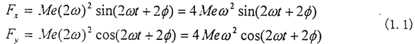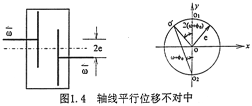 不對(duì)中具有一些典型的特征,如不對(duì)中比較嚴(yán)重時(shí)會(huì)使軸承的油膜壓力偏離正常值,聯(lián)軸器不對(duì)中時(shí)聯(lián)軸器兩端軸承的振動(dòng)較大,軸心位置不穩(wěn)定,而且在振動(dòng)頻譜中二倍頻分量幅值較大等。而對(duì)于齒輪聯(lián)軸器不對(duì)中產(chǎn)生倍頻振動(dòng)分量的機(jī)理研究又是其中的一個(gè)重點(diǎn)。文獻(xiàn)[68]指出,由于安裝時(shí)轉(zhuǎn)子軸心線不對(duì)中引起的振動(dòng),在用電機(jī)驅(qū)動(dòng)的轉(zhuǎn)子系統(tǒng)中,當(dāng)電機(jī)軸與負(fù)載機(jī)械由齒輪聯(lián)軸器連接時(shí),電機(jī)軸存在二倍頻的振動(dòng),而在單獨(dú)運(yùn)動(dòng)時(shí),倍頻振動(dòng)立即消失,這表明倍頻振動(dòng)完全是齒輪聯(lián)軸器耦合的結(jié)果。文獻(xiàn)[64,65]解釋了由于齒輪聯(lián)軸器不對(duì)勁中而產(chǎn)生二倍頻振動(dòng)的機(jī)理,以[65]中的軸線平行位移不對(duì)中為例見圖1.4,圖中ω為轉(zhuǎn)子的轉(zhuǎn)動(dòng)的解速度,2e為不對(duì)中量,M為內(nèi)齒套的質(zhì)量,φ0為起始回轉(zhuǎn)角。