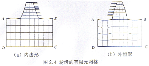 為了與上述方法進行數(shù)值比較,在此對內(nèi)、外齒輪的輪齒進行有限元法分析。輪齒的有限元網(wǎng)格劃分見圖2.4,輪齒網(wǎng)格的輪廓盡量模擬自然邊界?紤]到彈性基座的傾斜對柔度的影響較大,因此本文取AB=6m,AD=3.25m(m是齒輪的模數(shù))。載荷的分布與齒對的接觸情況有關,對于齒輪聯(lián)軸器齒面接觸比較特殊。本文將載荷均勻地分布于工作齒面上。節(jié)圓處的切向柔度為qt,相應的法向柔度[89]q=qtcos2α。計算結(jié)果見表2.3.