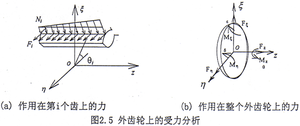 齒輪聯(lián)軸器上的受力是比較復雜的,對于外齒輪而言,除了與聯(lián)軸器連接的軸段對其的作用力外,還有內(nèi)齒套對外齒輪的作用力。轉(zhuǎn)子系統(tǒng)在運動過程中,內(nèi)外齒輪之間要發(fā)生相對運動,由于齒面間存在變形和摩擦,因此在外齒輪的齒面上會產(chǎn)生與齒面垂直的正壓力Ni和與齒面相切的摩擦力Fi,見圖2.5a。如果將各齒面上的作用力分別向外齒輪的中心O簡化可以得到作用于O點的一個力和一個力偶,并將該力和力偶分別分解到三個軸上,得到三個分力Fξ、Fη、Fz三個力偶矩Mξ、Mη、Mz,如圖2.5b所示。